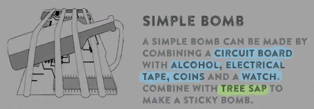 A sticky bomb is an upgrade of a bomb; when it is thrown it sticks to what ever it hits first. It can be attached to cannibals and mutants, making it easier to hit them with explosives. It will not roll away from its target. It can also be placed on trees instead of throwing it near them.