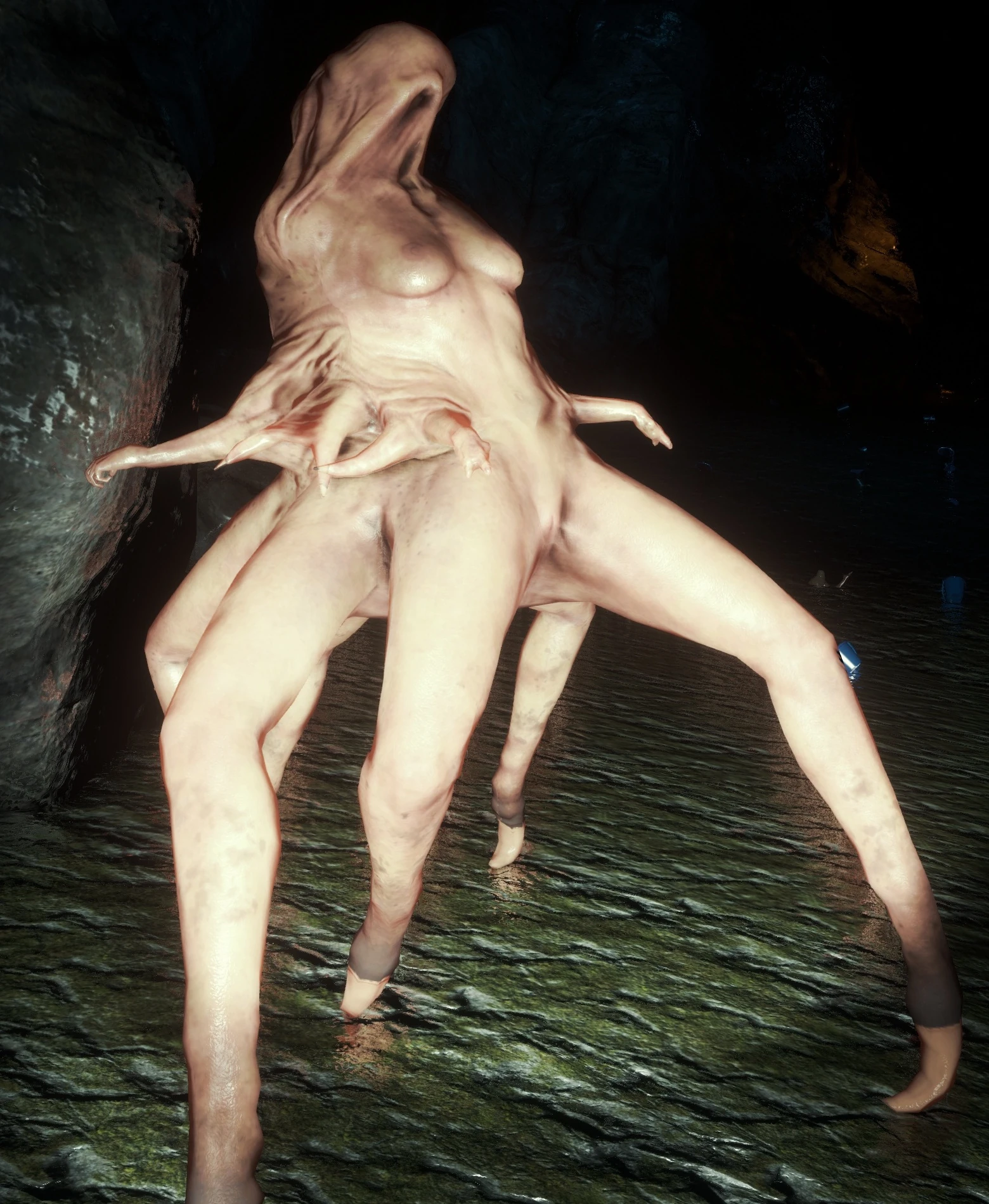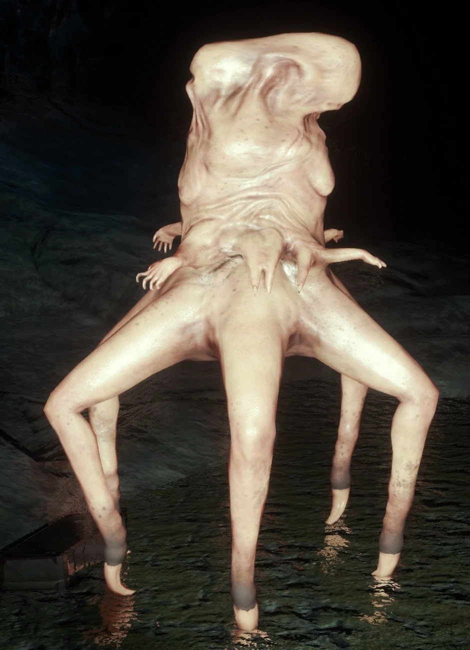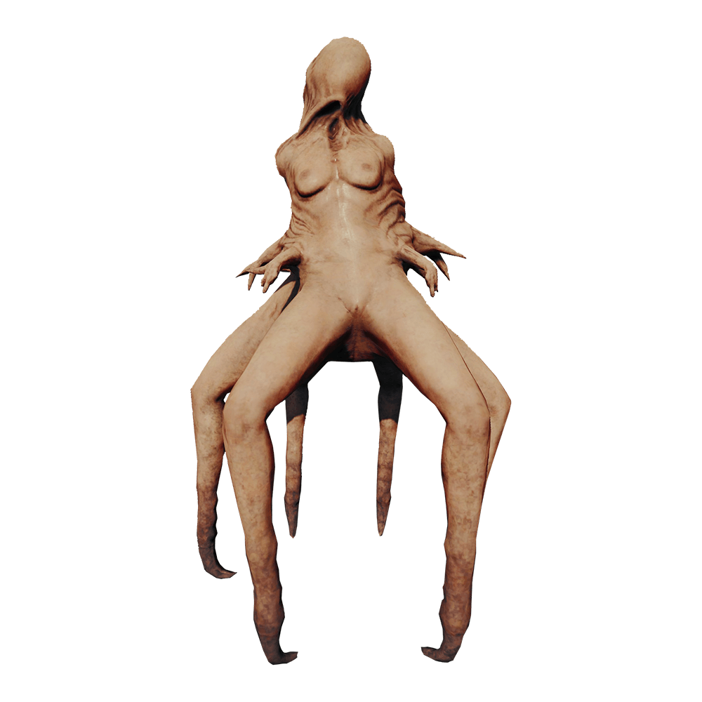 Like the Armsy, it appears to be formed by two (possibly three) bodies that are struggling and writhing against each other. The Virginia has 6 legs, claw-like feet, breasts, and 6 malformed arms (four of which appears to have been split in half). The Virginia is also the only creepy mutant with visible genitalia, as the vulva of the front female body appears to be extended along the underside to connect to the vulva of the rear female body. The Virginia has no facial features. However, the front side of the Virginia appears to be the side with the two least malformed arms with functional hands.